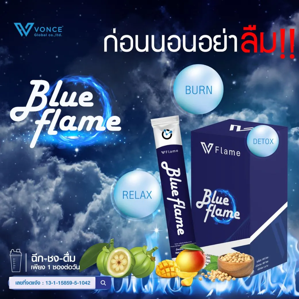 Blue Flame VFlame (บูล เฟลม วีเฟลม) เพิ่มประสิทธิภาพในการนอนหลับ เพิ่มอัตราการเผาผลาญขณะนอนหลับ ขับถ่ายง่ายขึ้นหลังตื่นนอน ชงดื่ม วันละ 1 ซอง ดื่มก่อนมื้อเที่ยง ลดการดูดซึมแป้ง ดื่มก่อนนอน หลับสบาย